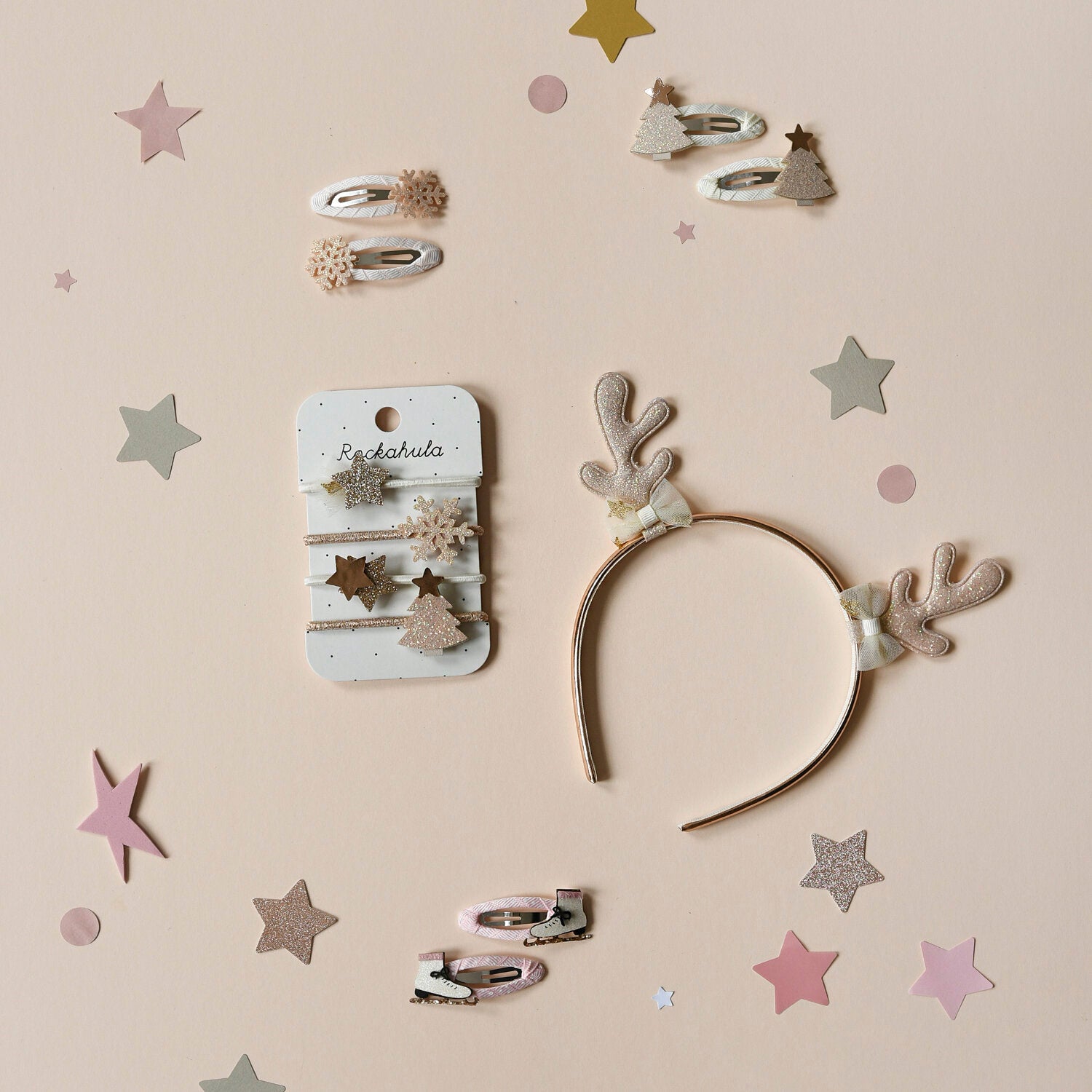 The sweetest headband to add a little festive shimmer to your Christmas! These pale pink glitter reindeer ears are adorned with gold tulle bows on each side. They are set securely onto a rose gold PU-covered band, which is designed to provide a comfortable fit for little heads.