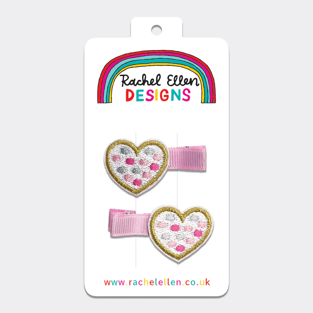 These lovely Heart hair clips are perfect for adding a touch of sweetness and sparkle to any hairstyle! This charming pair features embroidered hearts with polka dots, secured to clips with soft ribbon covering.