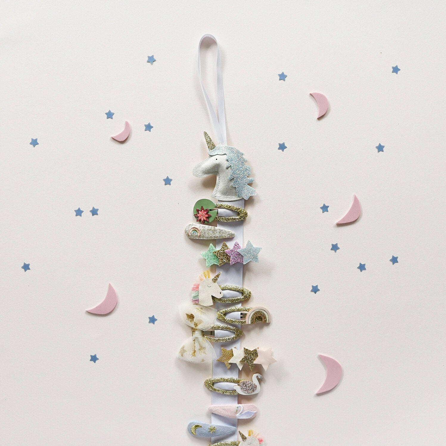 The perfect solution to storing and organising hair clips in one place - our clip hanger has a hanging loop that can be hung on a door or wall hook. Simply snap on your clips ready to wear again next time! Our unicorn clip hanger can fit around 12 clips (depending on clip size) and hangs perfectly on a grosgrain ribbon!
